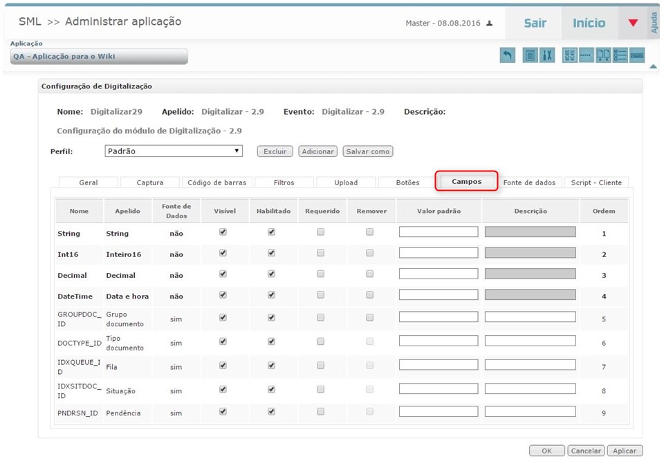 A aba Campos lista todos os campos da aplicação. É possível configurar se algum campo terá o preenchimento automático com algum valor pré-definido, além de quais campos serão exibidos para o usuário ao acessar o módulo: