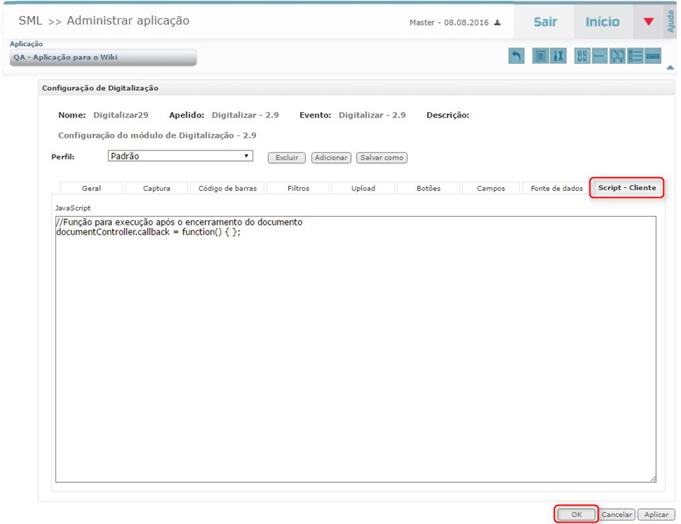 Na aba Script - Cliente é possível incluir um javascript que sempre será executado ao navegar pelo módulo: