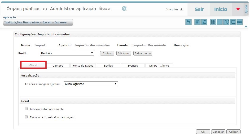Na aba Geral é possível configurar o ajuste na visualização das imagens importadas, indexar automaticamente e exibir o texto extraído da imagem: