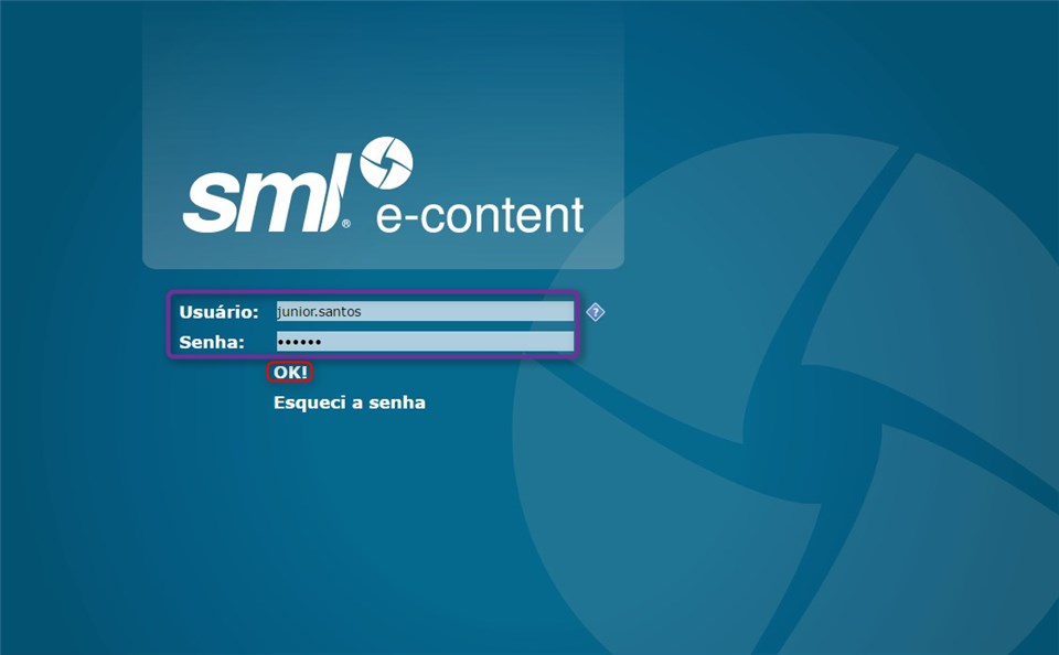 Efetue o primeiro login no Orquestra ECM utilizando o usuário enviado por e-mail e a senha definida. Para acessar o sistema, clique em OK| :