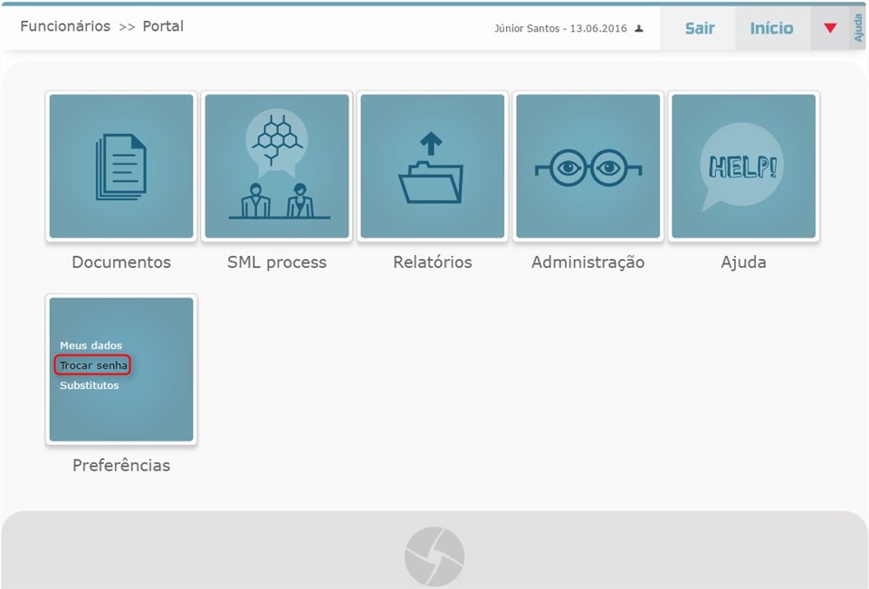 Sempre que o usuário desejar, ele poderá alterar sua senha na página do Portal do Orquestra ECM. A opção de Trocar senha encontra-se dentro de Preferências: