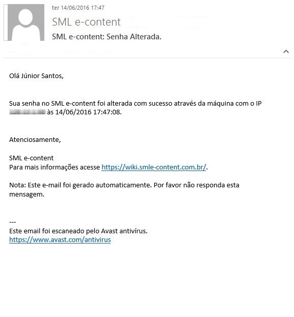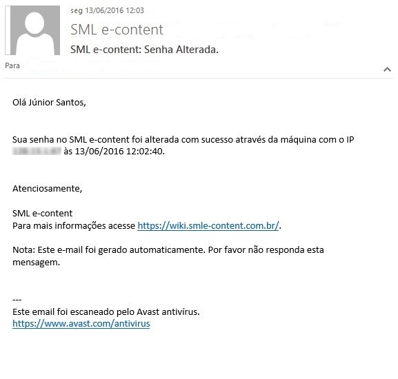 Como medida de segurança, sempre que uma senha é alterada o usuário é notificado por e-mail. Este e-mail contém as informações da data e hora da troca, ambiente utilizado e IP do computador que realizou a atualização.