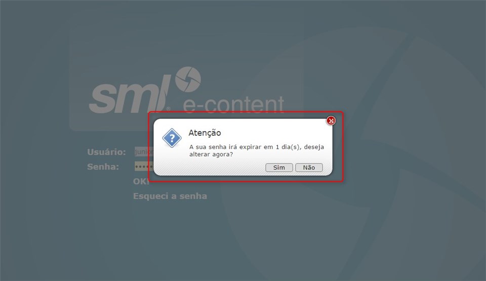 Se não desejar alterar a senha nesse momento, clique em Não na mensagem e continue acessando o sistema normalmente. Você continuará sendo notificado sobre a troca de senha nos seus próximos logins até que o prazo expire.