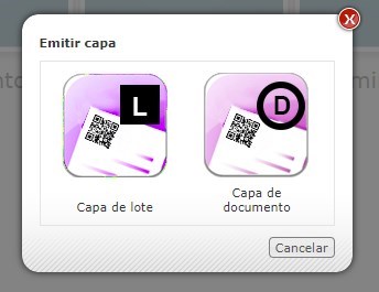 Em seguida, poderá ser exibido um modal para seleção do tipo de capa a ser criada (Capa de lote e Capa de documento). Selecione a opção Capa de documento: