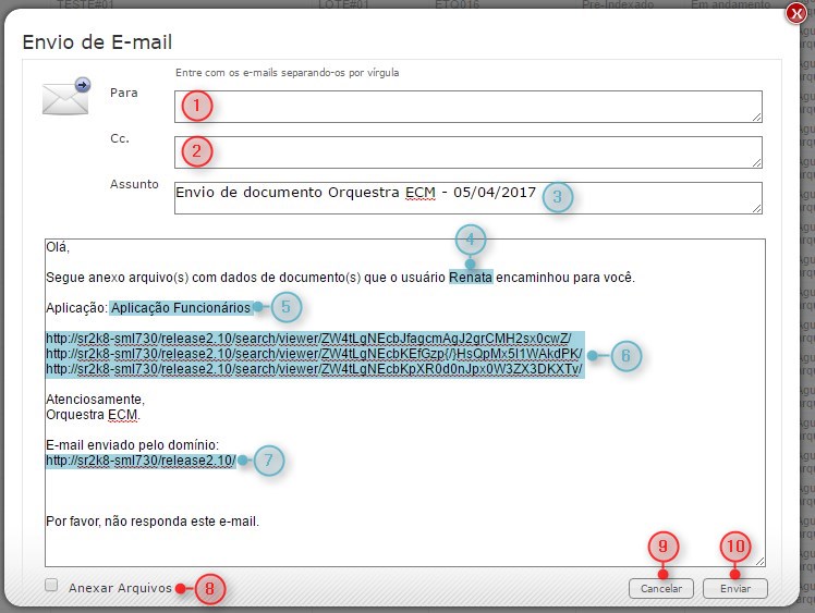 | 9 | Botão Cancelar: permite fechar a janela de envio por e-mail; |