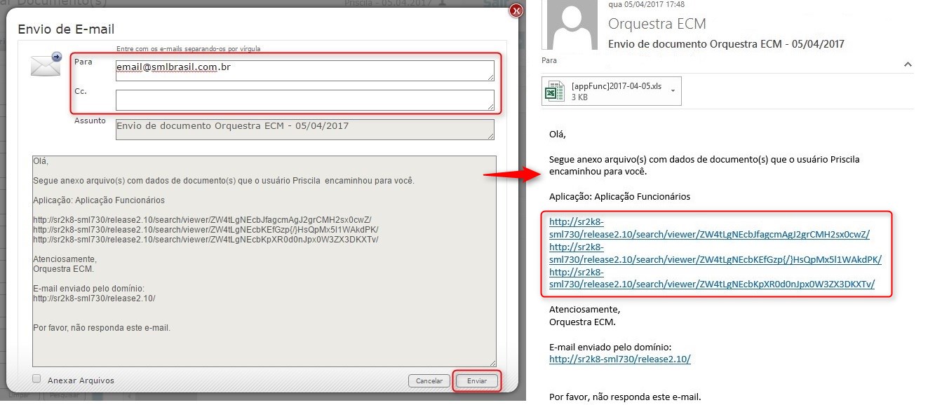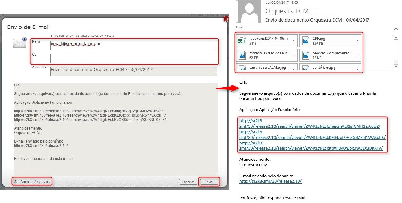 Caso o usuário que receberá o e-mail tenha acesso à mesma aplicação que o documento está armazenado no Orquestra ECM, recomenda-se que o envio do e-mail contenha apenas o link de acesso ao documento. Entretanto, se o destinatário não possui acesso ao Orquestra ECM, também é possível compartilhar os arquivos do documento, enviando-o como anexos do e-mail.