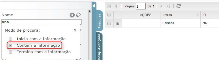Exemplo de pesquisa onde o filtro é configurado para que os resultados da busca contenham um determinado trecho de uma palavra.