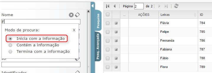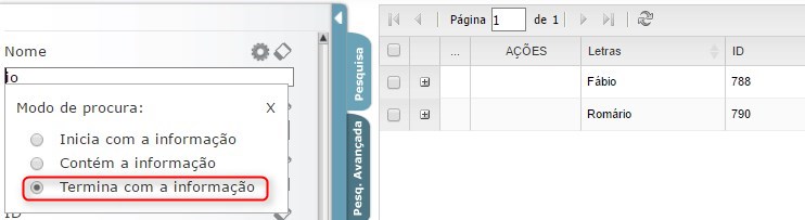 - Campos textuais: permitem efetuar filtros pelo início ou fim de um termo/palavras, assim como pesquisar por um determinado trecho de uma palavra ou frase;