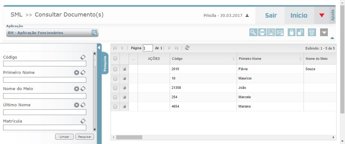 Após realizar uma busca - e se existirem documentos armazenados que correspondem aos filtros de pesquisa - será apresentada uma GRID com todos os resultados da pesquisa: