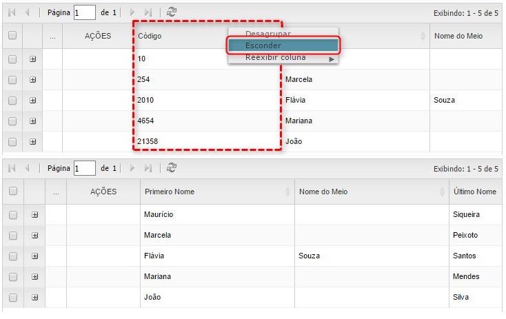 - Ocultar coluna: é possível ocultar uma coluna. Para isso, clique com o botão direito do mouse sobre o título da coluna e escolha a opção "Esconder";