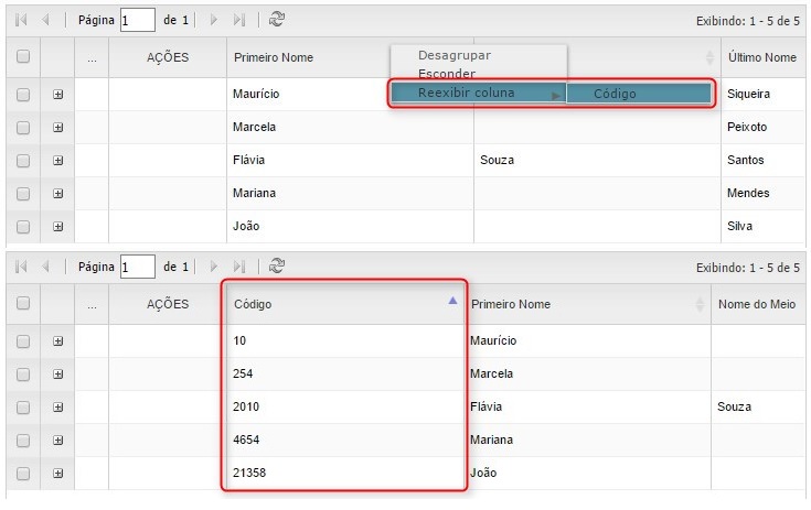 - Reexibir coluna: é possível reexibir uma coluna que estava oculta. Para isso, clique com o botão direito do mouse sobre o título de qualquer coluna e escolha a opção "Reexibir coluna", selecionando a coluna desejada;