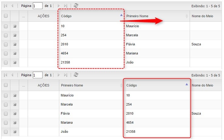 - Alterar ordem de exibição de coluna: é possível alterar a ordem de exibição de uma coluna na GRID de resultados de uma pesquisa, arrastando-a para a posição desejada;