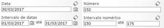 - Campos numéricos e datas: podem ser pesquisados como um valor único ou como um intervalo de valores;