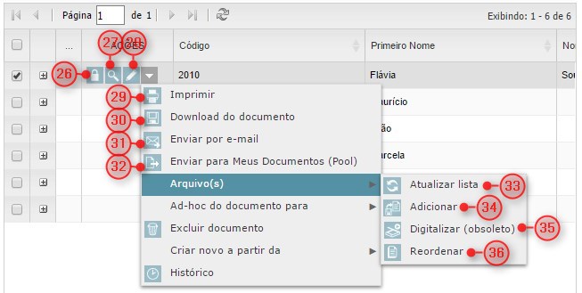 | 35 | Digitalizar (obsoleto): permite adicionar ao documento selecionado páginas que serão digitalizadas utilizando o módulo de digitalização (obsoleto) |
