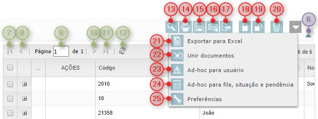 | 22 | Unir documentos: permite efetuar a união dos documentos que estão selecionados na GRID; |